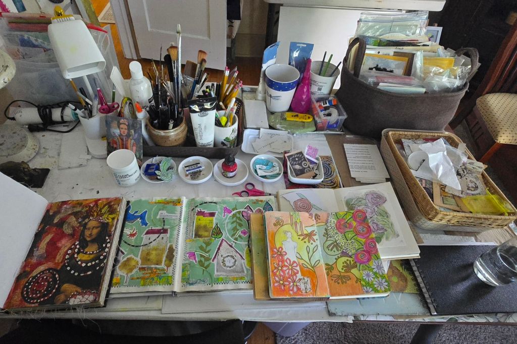 My mixed media studio changes according to my current creative obsession. When working on assemblage projects, tools, rusty bits, old photos, and wooden shapes spread out over my art table.
